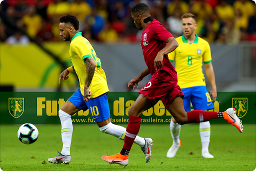 | Neymar disputa jogada com Pedro Miguel na vitória contra o Catar, em Brasília; Crédito da Imagem: www.gettyimages.co.uk/Buda Mendes |